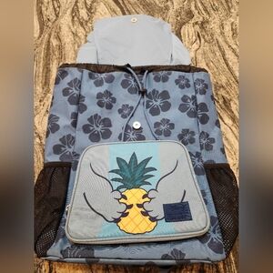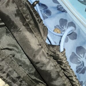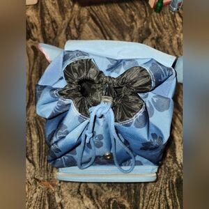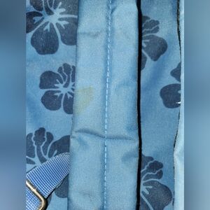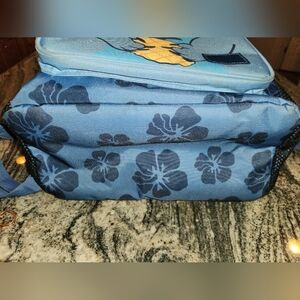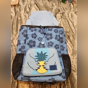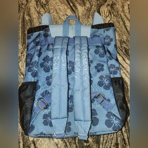Adorable Disney Stitch backpack for kids. Features a playful design with blue and pink colors. Perfect for school or travel. Has small stain on strap and draw string sleeve is slightly torn