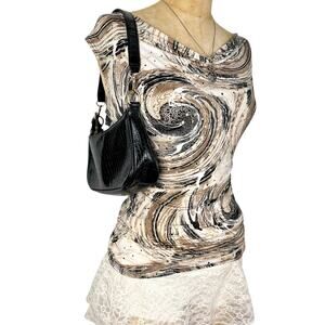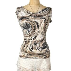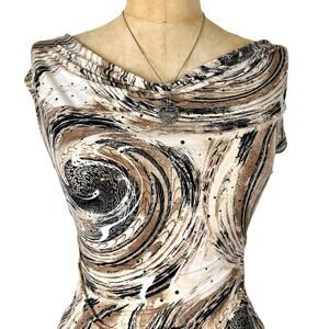 Y2K, 90s, Boho, Psychedelic, Swirl Print, Cowl Neck, Shannon Ford NY, Vintage, Earthy, Fairycore, Grunge Fairy, Whimsygoth, Going Out Top, Festival, Sequin, Embellished, Retro, Aesthetic, Size S, Brown, Neutral, Glam