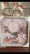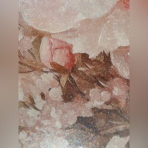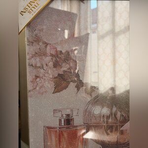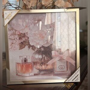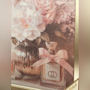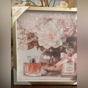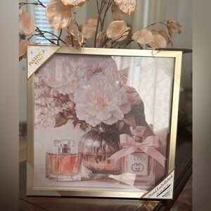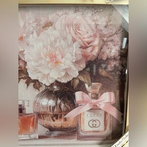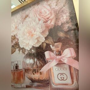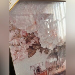 Chic art piece with fashion perfume and pink flowers. Adds luxury to decor.