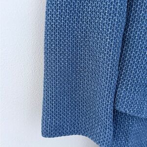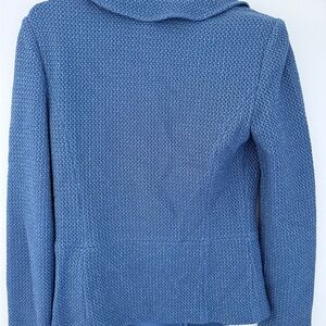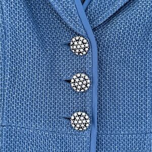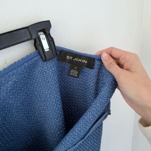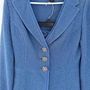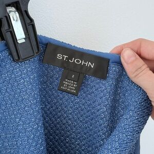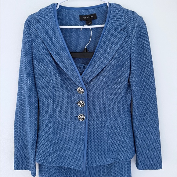 Elegant St. John two-piece knit set featuring a tailored jacket and matching skirt in a beautiful textured blue knit. The jacket is finished with signature crystal-embellished buttons and classic lapel styling, while the coordinating skirt offers a clean, flattering silhouette.