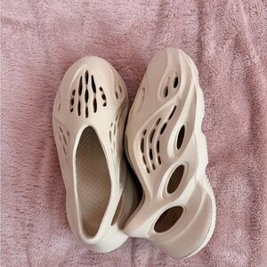 Stylish beige slip-on clogs with unique cut-out design. Perfect for casual wear.