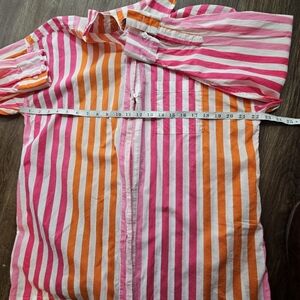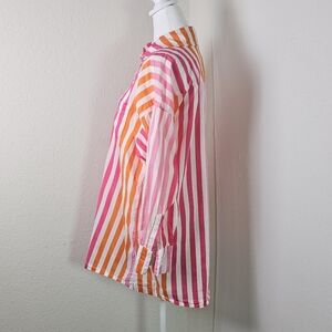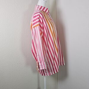 The Beach Riot Alexa Stripe Long Sleeve Shirt in size S/M is a casual, multicolor button-up top perfect for beach days, vacations, and resorts. Made from 100% cotton, this lightweight and breathable shirt features a collared neckline, button closure, and roll tab sleeves. The vibrant stripes and tropical theme make it a stylish choice for summer, fall, and spring seasons. Perfect for women looking for a preppy and colorful addition to their wardrobe.