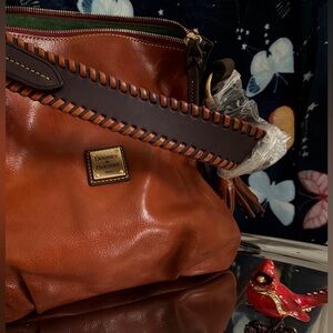 Elegant tan leather shoulder bag by Dooney & Bourke. Features braided detailing and a secure zipper closure.