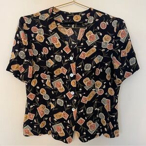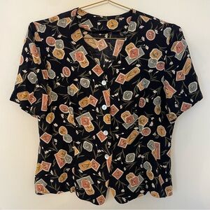 Stylish navy button-down with vibrant colorful floral stamp pattern. Short sleeves and classic collar. Perfect for casual outings.