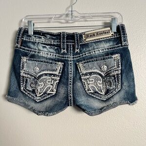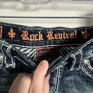 Dark blue denim shorts with detailed stitching. Features Rock Revival branding.
