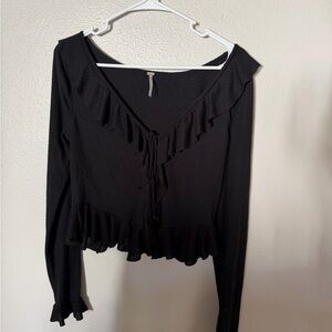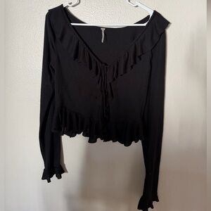 Chic black blouse with ruffle details. Long sleeves and v-neck design. Perfect for versatile styling.