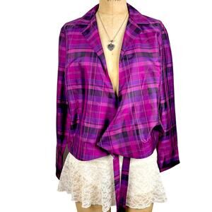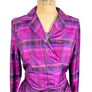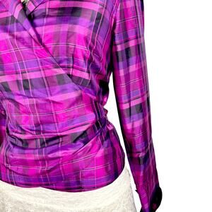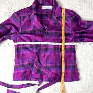 Worthington, 100% Silk, Silk Blouse, Wrap Top, Tie Back, Plaid, Purple Plaid, 90s, Y2K, Office Siren, Dark Academia, Grunge, Light Academia, Vintage Silk, Designer Vintage, Size Medium, Fuchsia, Colorful, Preppy, Chic