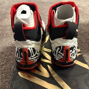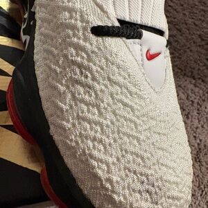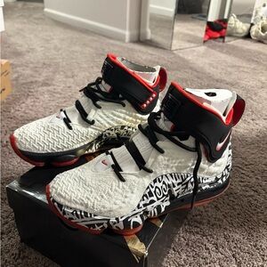 Dynamic Nike sneakers. Bold white and black design with red highlights. Ideal for active play.
