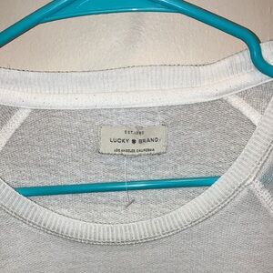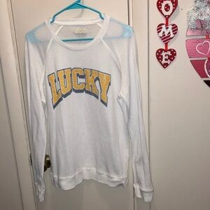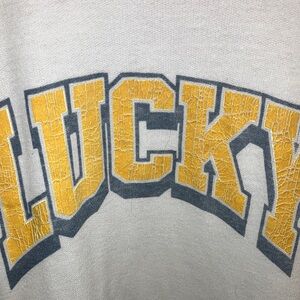 Cozy white sweatshirt with bold yellow and blue 'Lucky' graphic. Ideal for casual wear.
