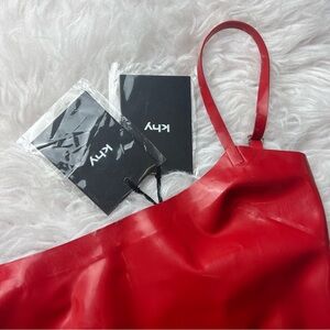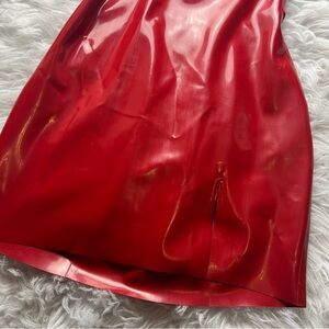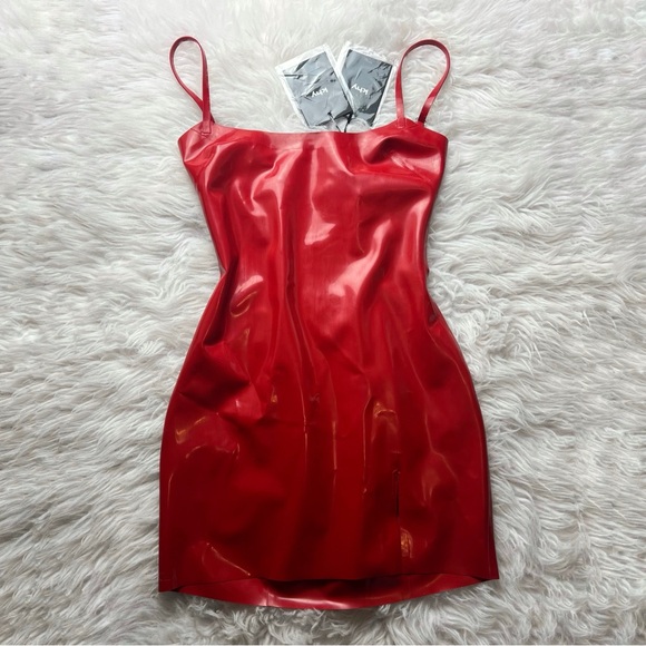Details from the site: A bodycon mini dress with adjustable heart-shaped sliders at the shoulder straps, featuring a zip closure at back and a slight slit at the thigh. All in ultra-high-gloss latex.
