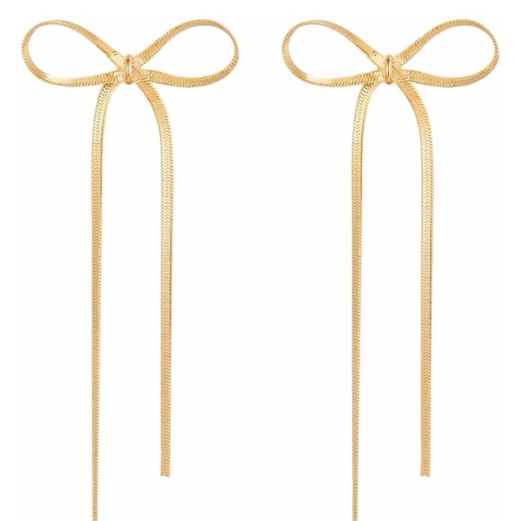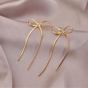 Chic gold, dangling bow earrings. Perfect for adding a touch of elegance. ~3.5” long and 1” wide