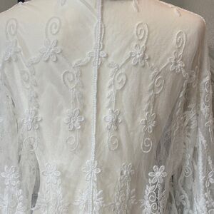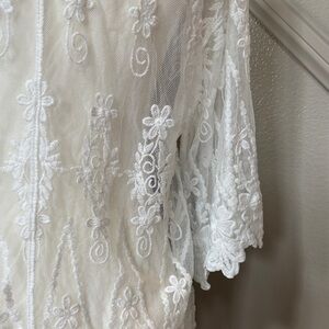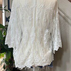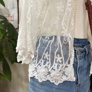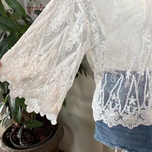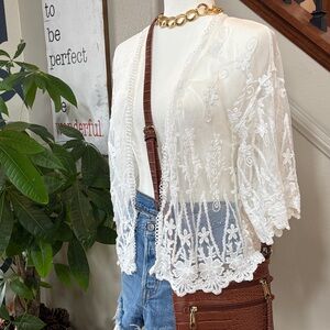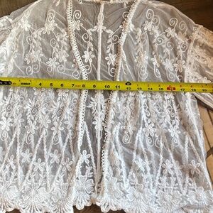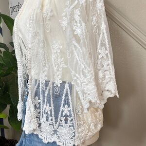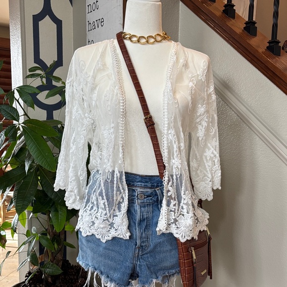 Gorgeous sheer white lace cardigan featuring intricate floral embroidery and scalloped hem detail. Lightweight and perfect for layering over tanks, dresses, or swimwear for a chic & classy boho look 🤩