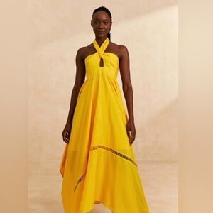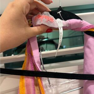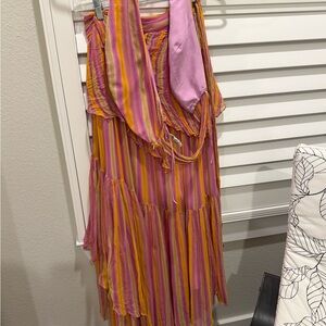 SOLD halter design with vibrant stripes. Flowy and elegant for any occasion. The halter top is separate from the skirt. I am selling both together. Has a tiny snag from storage but I have not worn it.