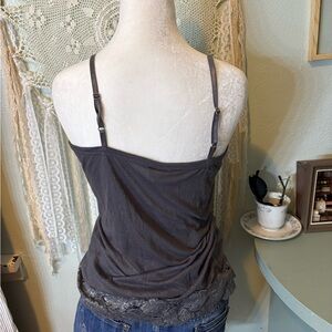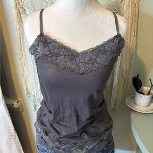 This elegant gray cami top features delicate lace trim, perfect for adding a touch of sophistication to any outfit. Ideal for both casual and formal occasions.