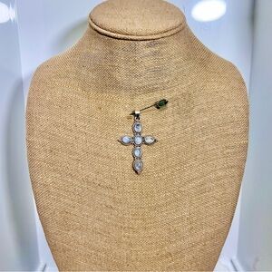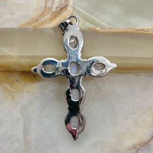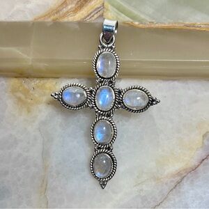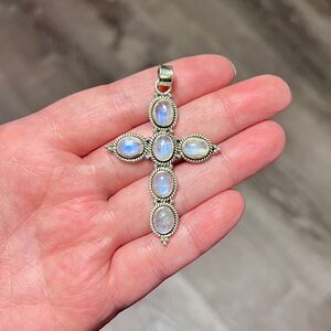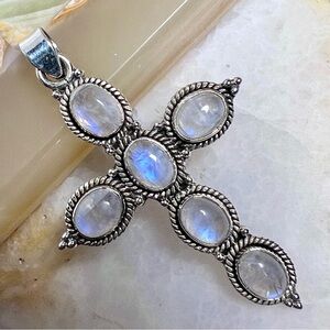 Large Rainbow Moonstone Cross Pendant Sterling Silver