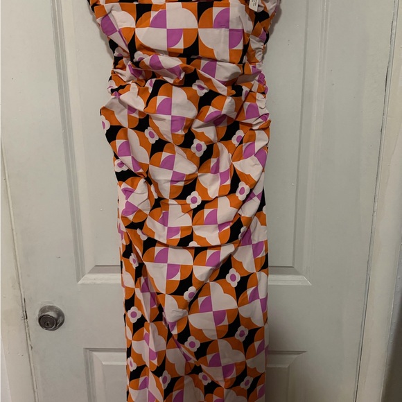 Bold dress with geometric patterns in orange, purple, and black. Eye-catching and stylish.