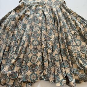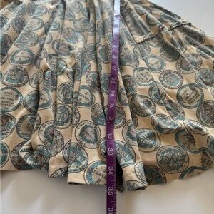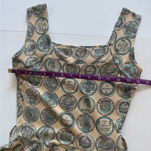 Super cute and unique fit & flare dress with an eye-catching vintage-inspired stamp/coin print in beige and teal tones. Flattering structured bodice with a full swing skirt—perfect for a retro look, biker vibe, pinup style, or everyday statement outfit! 🖤🏍️✨