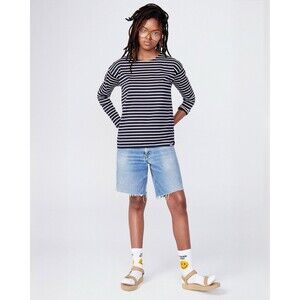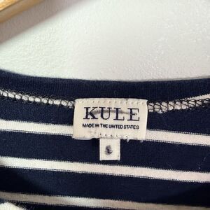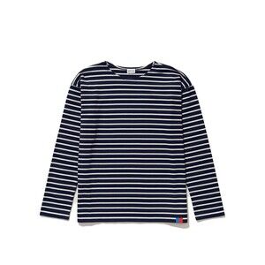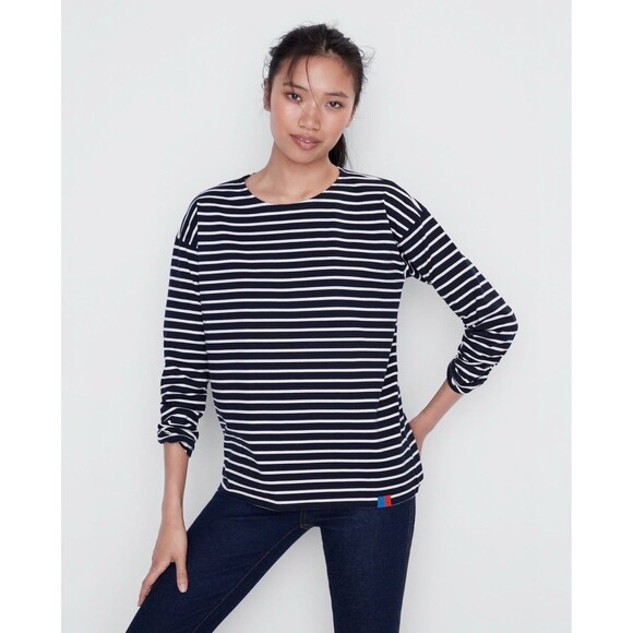 ⭐️ This classic KULE "The Boyfriend" top is a timeless piece inspired by iconic styles worn by figures like Brigitte Bardot. Crafted from a slightly heavier-weight 100% cotton knit jersey, it offers a relaxed, roomy feel while maintaining a feminine trim sleeve. The navy and cream stripes provide a preppy, versatile look perfect for all seasons. Features the signature KULE red and blue hem tag. Machine washable for easy care.