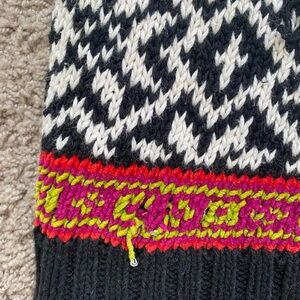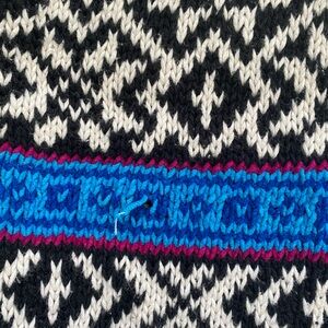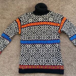 Stay warm and stylish with this black and white patterned sweater featuring vibrant red and blue accents. Perfect for any casual outing.