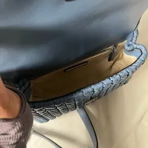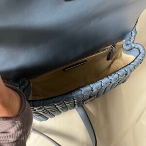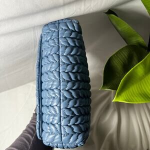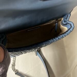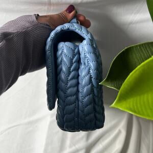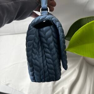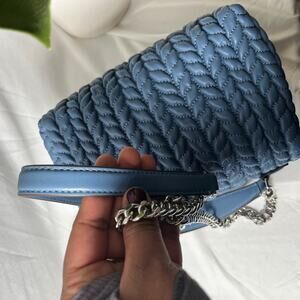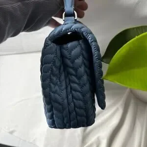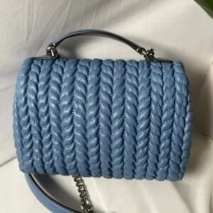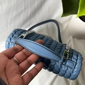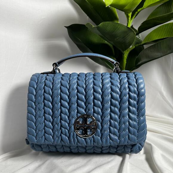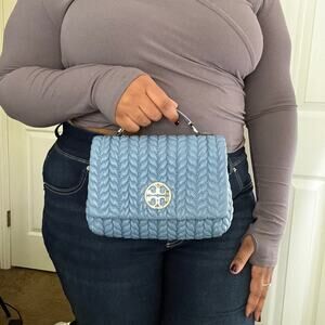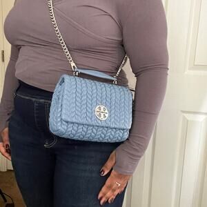 This chic blue shoulder bag from Tory Burch showcases a luxurious quilted texture and a gleaming silver-tone chain strap, ideal for elevating your everyday style. Its structured design and signature silver hardware add a touch of elegance to any ensemble.