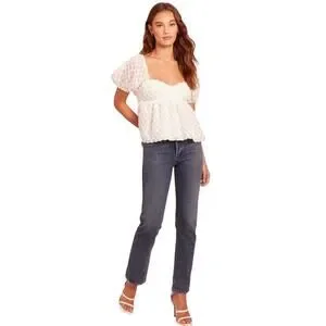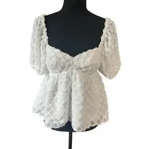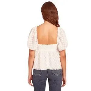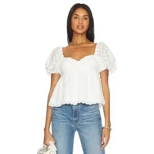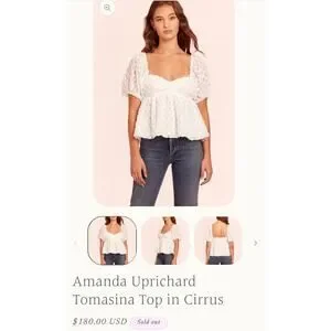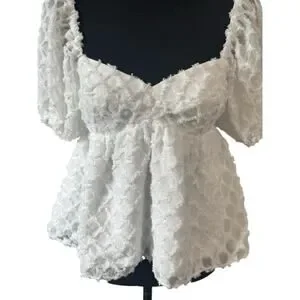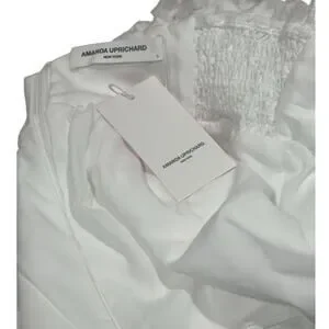 This exquisite white blouse by Amanda Uprichard showcases voluminous puff sleeves and a ruffled design, creating a romantic and feminine silhouette. The textured fabric adds a subtle sheen, enhancing its elegant appeal. Perfect for adding a touch of sophistication to any outfit.