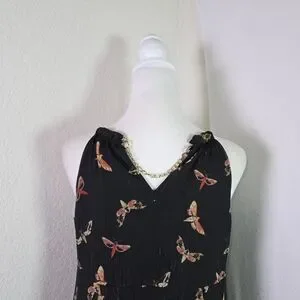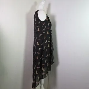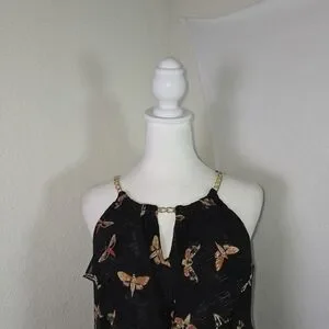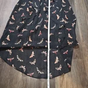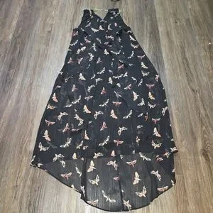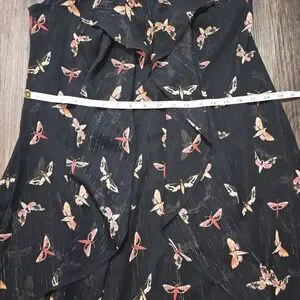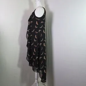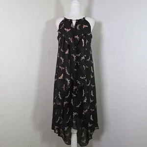 Stunning Thalia Sodi women’s high-low dress in black with a whimsical butterfly print and subtle metallic threading. Features a sheer overlay, ruffle front, and chain strap detail at the neckline. Lightweight and flowy with a fully lined interior. Perfect for summer parties, casual outings, or evening events.