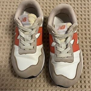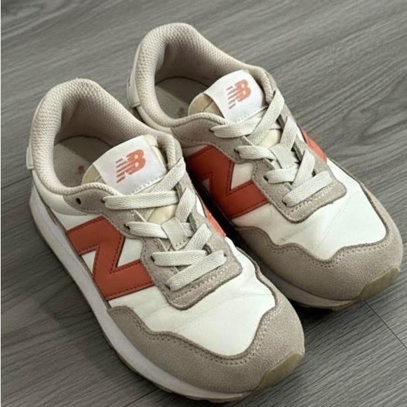 Chic New Balance sneakers for kids. Cream and orange design. Ideal for play and daily wear.