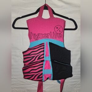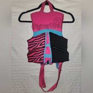 Vibrant Hyperlite life vest for children. Features a stylish pink and blue design with zebra print accents. Secure buckle closures for safety.