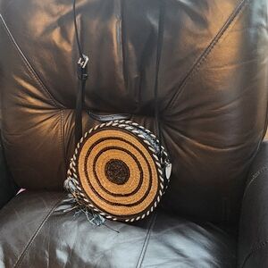 Stylish round woven design. Black trim with colorful tassel. Ideal for everyday use.