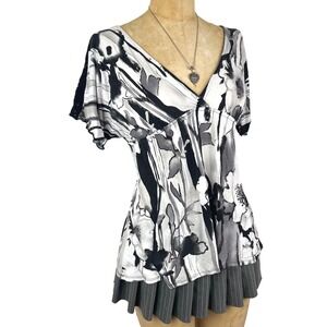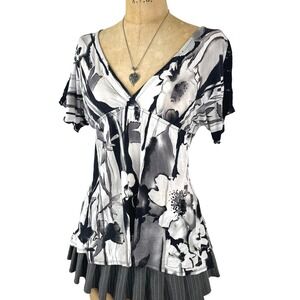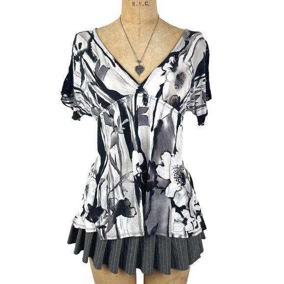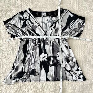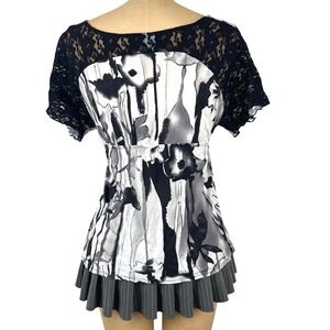 Dark feminine babydoll top with a bold black and white floral print and delicate lace shoulder detailing on the back.