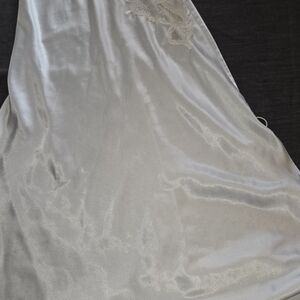 The product is an ivory lace and white satin nightgown lingerie slip by Oscar de la Renta. This sleeveless gown features a V-neckline and is made of polyester satin fabric. The gown has embroidered accents and a strap detail, giving it a classic and elegant look. It is designed for a size M and is machine washable, making it easy to care for. Perfect for summer and spring, this lightweight gown offers a comfortable and stylish option for intimate wear.