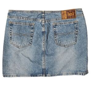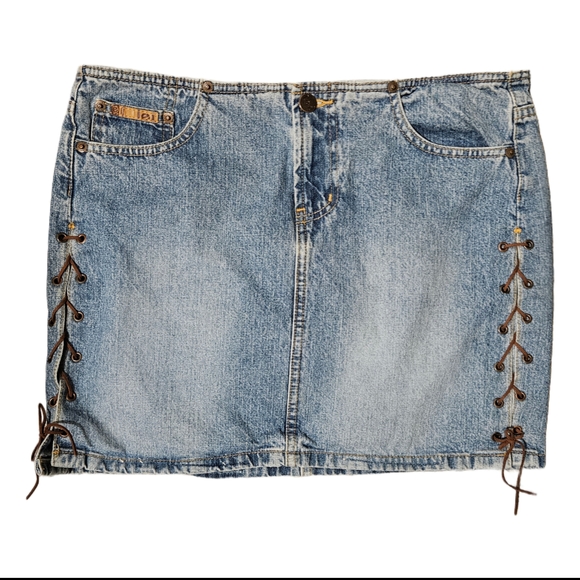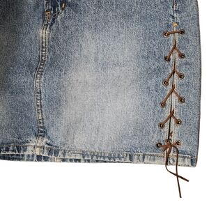 L.e.i's blue denim skirt with brown lace-up details. Leather chord was replaced by me and is sturdy.