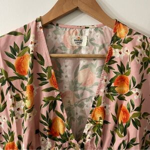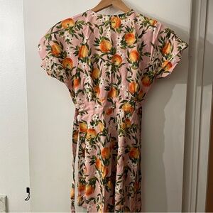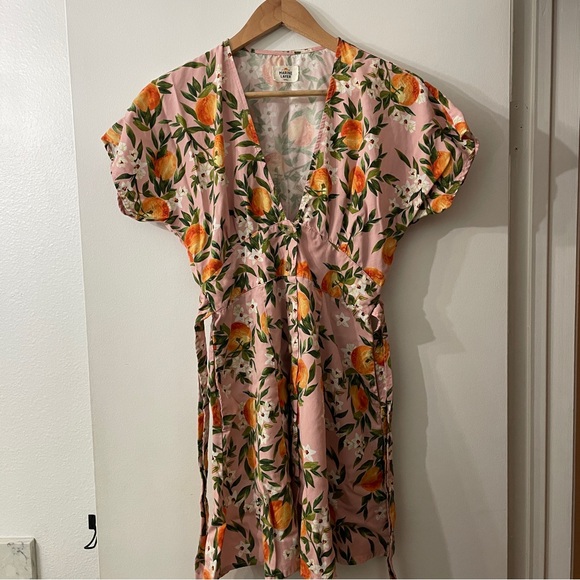 Charming mini dress with vibrant floral orange print. Features a flattering V-neck and short sleeves. Perfect for a casual outing.