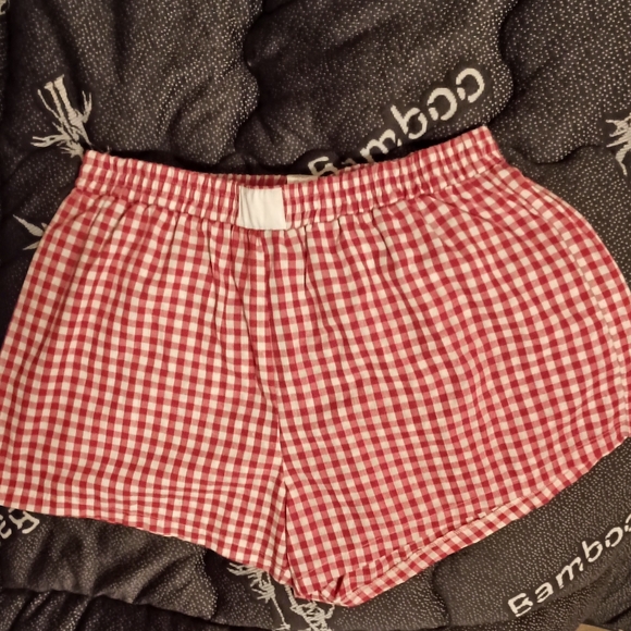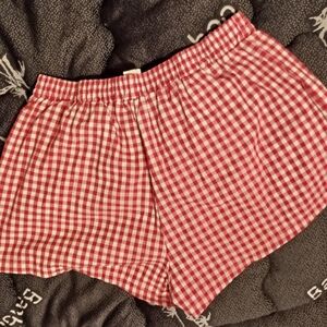 Never worn. lying flat, 17 inches across waist (without stretching). Length is ~15 inches. Elastic waist, no pockets. Stylish red and white gingham shorts. Perfect for casual wear.
