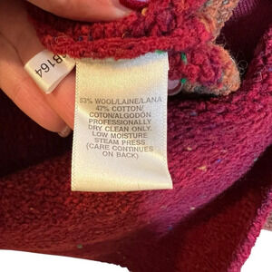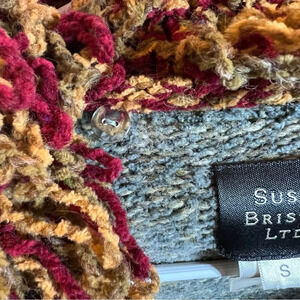 Vintage Susan Bristol wool-blend sweater. Featuring a vibrant colorblock design in olive, mustard, rust, and burgundy tones, this sweater coat stands out with its removable textured fringe collar, allowing you to switch between two striking looks.
