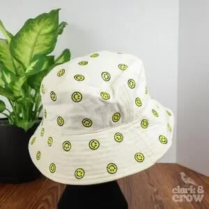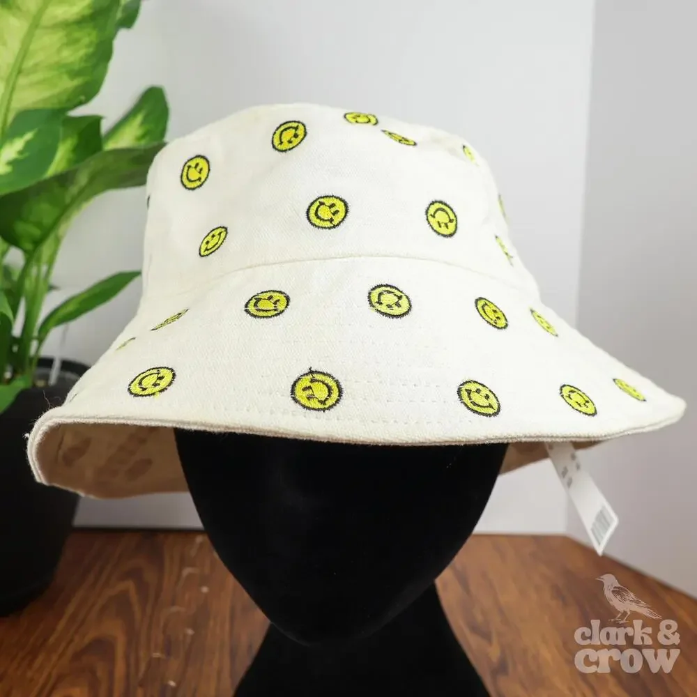 Urban Outfitters Smiley Face Bucket Hat Cream Yellow One Size Cotton