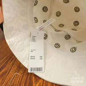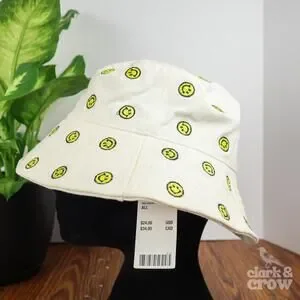 Urban Outfitters bucket hat in cream with allover yellow smiley face print. Made from 100% cotton with a soft structured feel and classic wide brim silhouette. One size fits all. Lightweight and comfortable, perfect for summer, festivals, streetwear looks, or everyday casual wear. Fun retro-inspired design that pairs easily with neutral or bold outfits. New with tags attached.