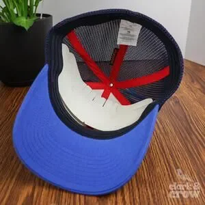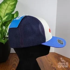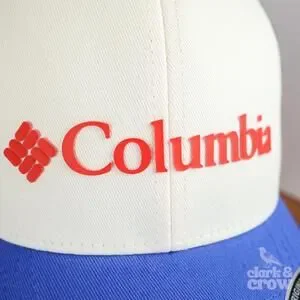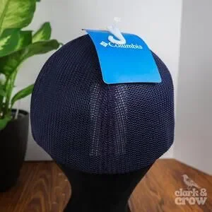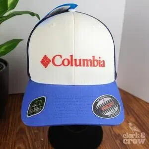 Brand new Columbia Flexfit trucker hat in size S/M. Features a white high crown front with red Columbia logo, blue bill, and navy stretch mesh back. Side patch detail with 1938 logo. Flexfit stretch design for a comfortable secure fit. Interior red taping. Shell 100% cotton with stretch mesh back (polyester/polyurethane blend). Made in Vietnam. Clean, new condition with original tags attached.