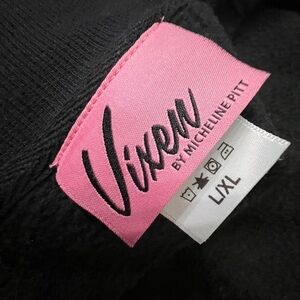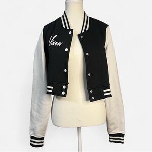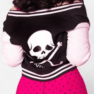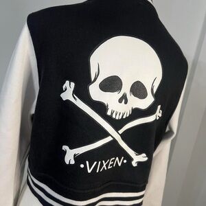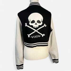 VIXEN GIRL GANG LETTERMAN JACKET - VIXEN BY MICHELINE PITT. This crop jacket features original Micheline Pitt skull artwork on the back and the Vixen logo on the front. This jacket was designed to fall at the natural waist and has a relaxed boxy fit.