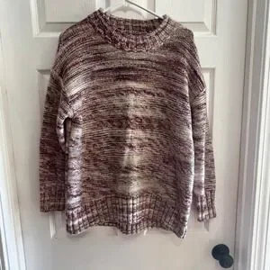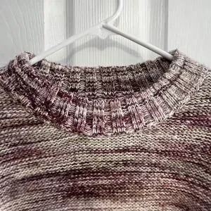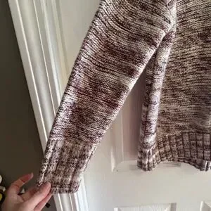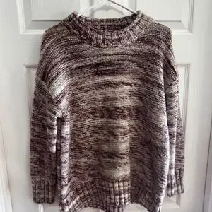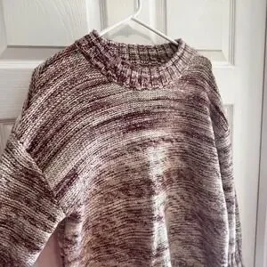 Keywords: Chunky knit, Mock neck, Marled, Burgundy, Cream, Oversized, Cozy, Warm, Textured, Fall fashion, Winter wear, Casual sweater, Long sleeve