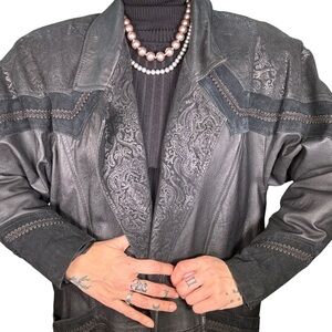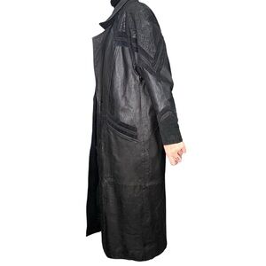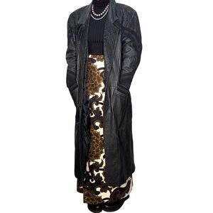 This Maurices black leather trench coat with a touch of elegance is so late 80s early 90s. Pump up your hair and pull on your slouch boots. It’s in excellent condition (aside from some spots that I will clean b4 shipping I think they are from being long & on a sale rack). It has a button front & delicate detailing on the collar, lapels, shoulders, cuffs, pockets & back. A real vintage gem! It’s also quite warm
