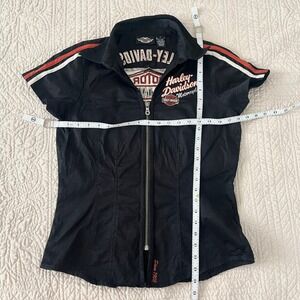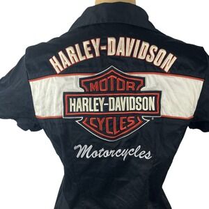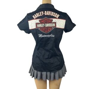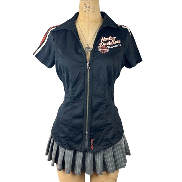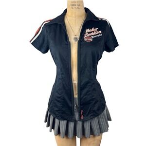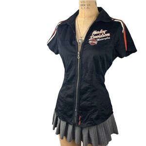 Vintage harley davidson biker zip up short sleeve shirt with embroidered logos.