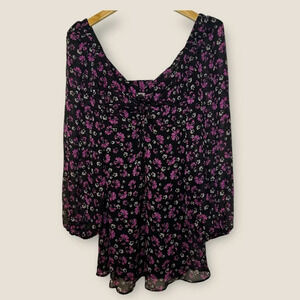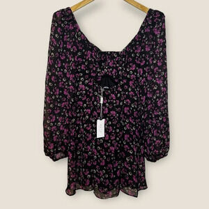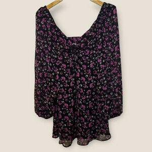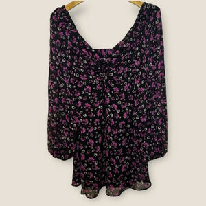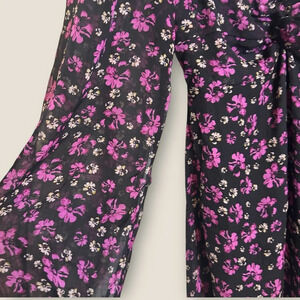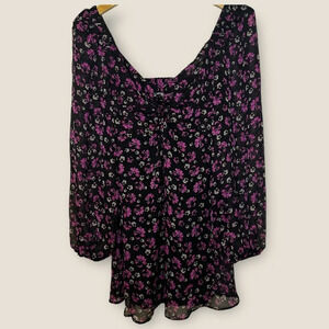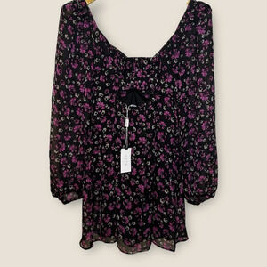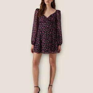 Beautiful and feminine, this mini dress features a stunning floral print in black and purple hues. Designed with a sweetheart neckline and ruched bodice for a flattering silhouette. The sheer long sleeves with elastic cuffs add elegance, while the open back with strap detailing creates a modern look. Fully lined for comfort.
