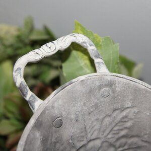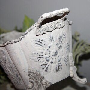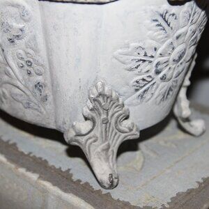 Vintage 5.5" tall x 11.75" wide through handles x 6.5" deep metal cachepot dish. Pretty details with a distressed pale gray and off white patina, ornate feet and handles at each side. Very Shabby, French look to this unique piece! ⭐ SOLD AS IS. Gorgeous pot for French Country, Victorian, Shabby Chic or vintage-inspired decor!