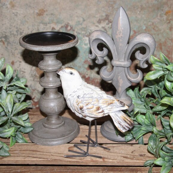 NEW 7.25" tall x 6" wide x 3.25" deep ornate and colorful resin bird with iron feet, NEW 9" tall x 5" gray wood candle holder and NEW 12" tall x 6" wide x 4" deep distressed gray resin Fleur De Lis decor finial. Great trio for French Country decor!
