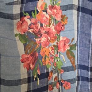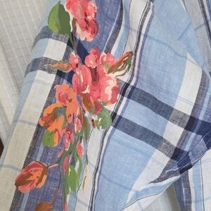 Made from lightweight and breathable linen material, it is perfect for warm spring days. The blue plaid pattern with floral accents gives it a nature-inspired and timeless look, making it a versatile piece for any occasion.