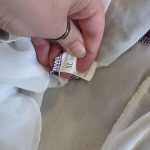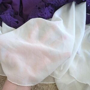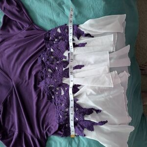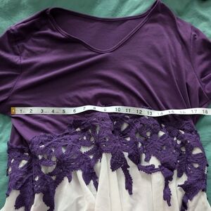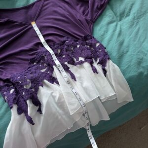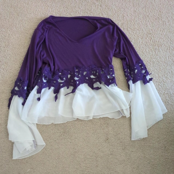 Purple and white lace top with bell sleeves. White parts are sheer. Worn only three or four times. Size XL