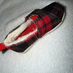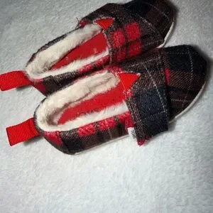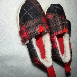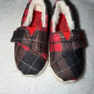 Adorable Toms baby shoes with red and black plaid design. Soft faux fur lining for comfort. Toms Red and Black Plaid Fur Lined Shoes. Size 7. Preloved.