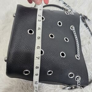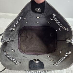 Elevate your everyday look with this striking black bucket bag. Featuring a bold, all-over silver grommet design and a decorative front chain, this bag perfectly blends "rocker chic" with practical functionality. The exterior is crafted from a high-quality pebbled faux leather that is both durable and stylish.