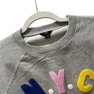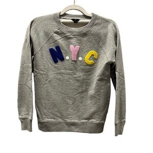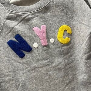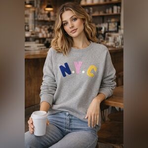 Cozy gray NYC graphic sweatshirt featuring colorful appliqué lettering for a playful, street-style look. Soft, comfortable, and perfect for layering or travel days.